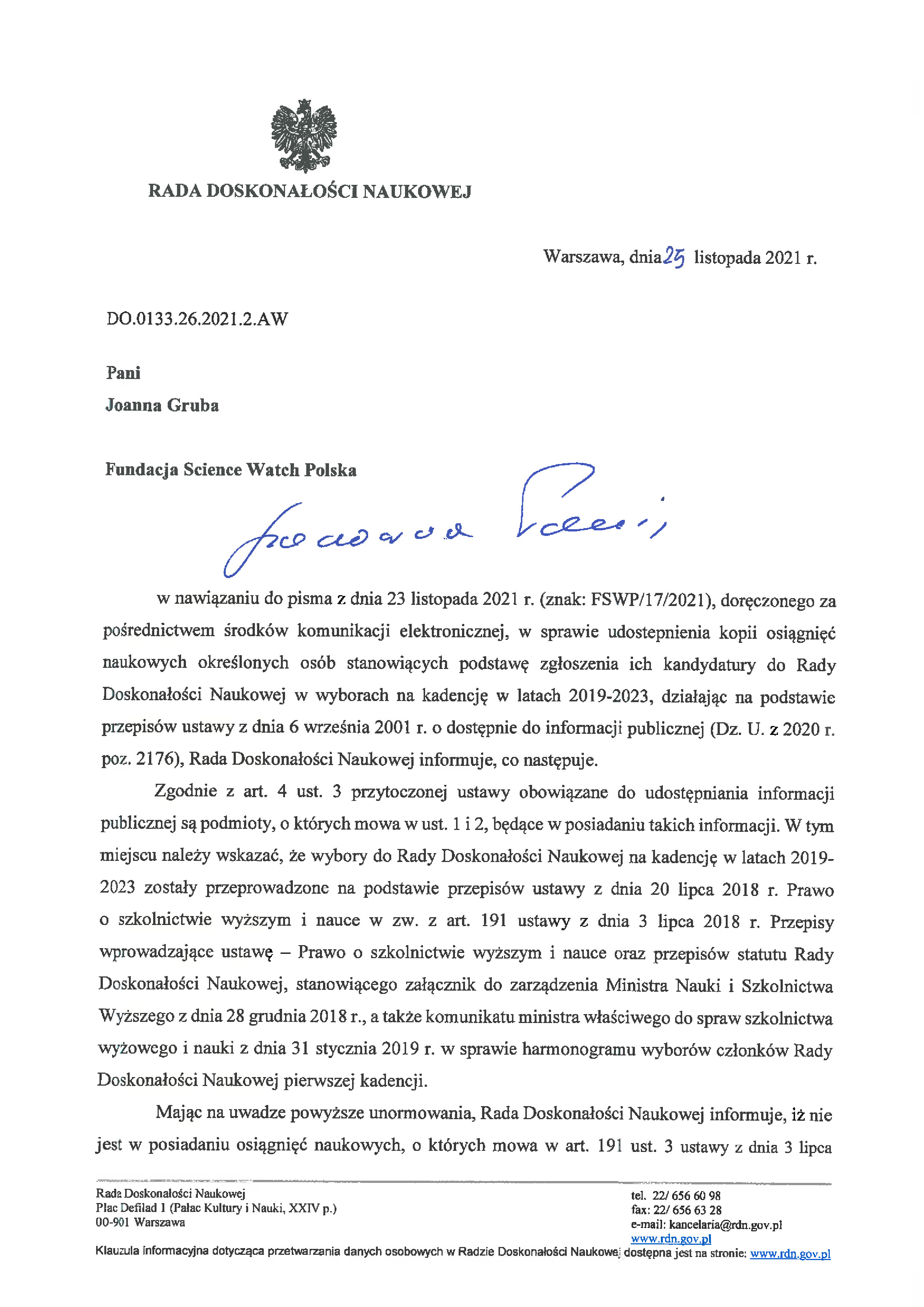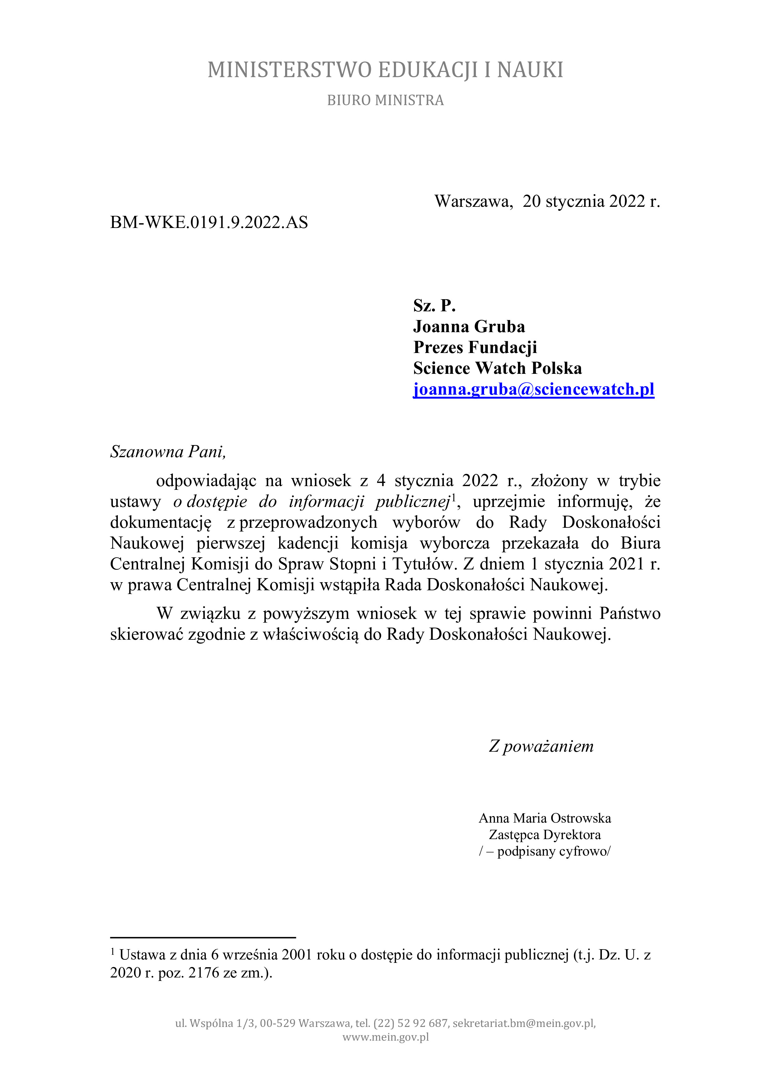 Ponieważ wybory do RDN prowadzone były na podstawie przepisów Ustawy Prawo o szkolnictwie wyższym, 3 stycznia 2022 r. zwróciliśmy się z wnioskiem o udostępnienie żądanej informacji do Ministerstwa Edukacji i Nauki. W odpowiedzi otrzymanej 20 stycznia 2022 r. Ministerstwo informuje, że „dokumentację z przeprowadzonych wyborów do Rady Doskonałości Naukowej pierwszej kadencji komisja wyborcza przekazała do Biura Centralnej Komisji do Spraw Stopni i Tytułów (…)”