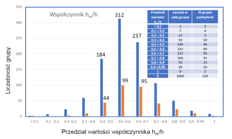 Na rys. 1 przedstawiono ważny dla omawianej problematyki rozkład współczynnika hm/h w grupie naukowców z Polski ujętych w rankingu TOP2% za lata 1996-2006 (czyli w kategorii kariery naukowej) z podziałem na przedziały co 0,1. Rozkład dla ogółu instytucji naukowych i grupy politechnik jest bardzo zbliżony z największą grupą naukowców ok. 73% dla przedziału 0,4¸0,7 z dominantą w przedziale 0,5¸0,6. Zdarzają się nieliczne przypadki skrajne, tj. z minimalnym udziałem <0,1 (0,03) i maksymalnym, tj. 1. Osoba z minimalnym udziałem indywidualnym ma jednak wykazany udział cytowań własnych ok. 60%.