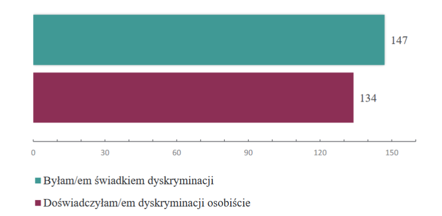 Wśród studentów oraz studentek deklarujących, że w trakcie studiów zetknęli się z dyskryminacją, 134 wskazało, że dyskryminacja dotyczyła ich osobiście, natomiast w 147 przypadkach ofiarą dyskryminacji był inny student lub studentka (por. rys. 2). Ankietowani mieli możliwość zaznaczenia obu z wymienionych odpowiedzi. Na tej podstawie można stwierdzić, że przejawy dyskryminacji na uczelniach nie ograniczają się do pojedynczych sytuacji. W większości przypadków, jeśli już studenci zetknęli się z dyskryminacją w trakcie studiów, to zarówno doświadczyli jej w sposób bezpośredni, jak i byli świadkami, gdy była wymierzona w inną osobę.