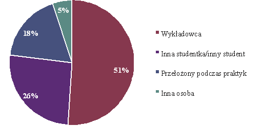 W odpowiedzi na pytanie, kto był osobą dopuszczającą się dyskryminacji, połowa ankietowanych wskazała wykładowcę (por. rys. 3). Sytuacja ta powinna budzić niepokój, biorąc pod uwagę silniejszą pozycję wykładowcy względem studenta, co może prowadzić do przykrych dla studentów konsekwencji. Relacja oparta na silnej zależności jednej ze stron od osoby uprzywilejowanej powinna być monitorowana, ponieważ pozostawia większe pole do nadużyć. Tak jak przepisy prawa pracy chronią pracownika względem uprzywilejowanego w tej relacji pracodawcy, tak i studenci w relacji z wykładowcą powinni mieć możliwość skorzystania z instrumentów służących ich ochronie. Podobnie w przypadku, gdy dyskryminacji dopuszcza się przełożony podczas praktyk, co sygnalizowało 18% respondentów. W tym miejscu warto zwrócić uwagę, że studenci uczelni medycznych odbywają w trakcie studiów obowiązkowe praktyki obejmujące setki godzin w różnego rodzaju placówkach leczniczych. Stąd decyzja o tym, aby ten czas również objąć badaniem oraz dowiedzieć się, czy zachowania patologiczne względem studentów mają miejsce również w placówkach zewnętrznych współpracujących z uniwersytetami. Jak pokazały wyniki, decyzja ta była słuszna, gdyż znaczna liczba respondentów wskazała, że to właśnie podczas praktyk doświadczała dyskryminacji, mogącej przejawiać się m.in. w postaci utrudniania dostępu do pacjentów. Fakt ten skłania do zastanowienia się nad tym, czy obszar aktywności studentów związany z praktykami studenckimi nie powinien znajdować się pod większą opieką uczelni. Nie można także przeoczyć faktu, iż w wielu przypadkach to inni studenci dopuszczają się dyskryminacji względem kolegów bądź koleżanek mimo braku wyraźnej zależności hierarchicznej.