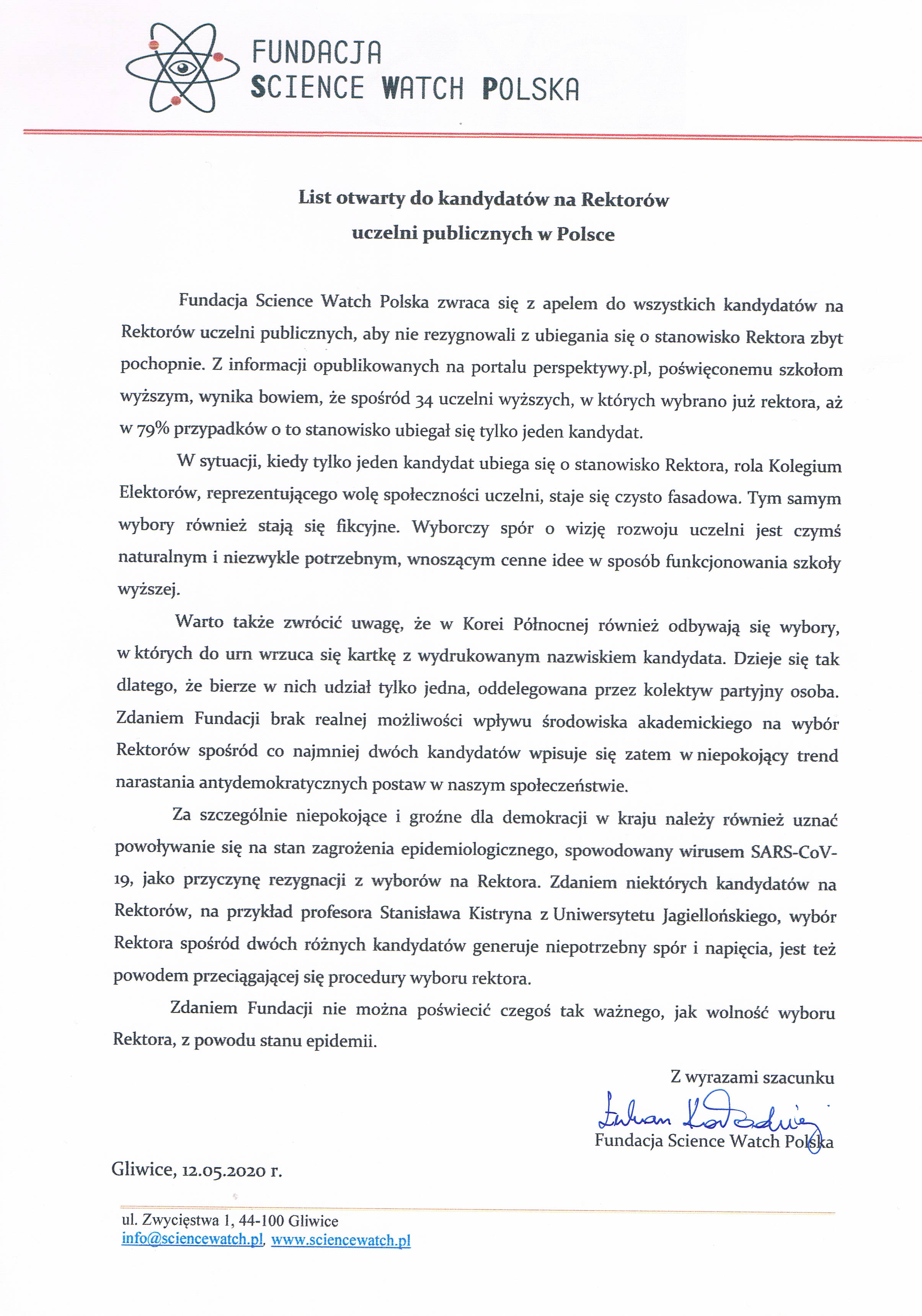 W związku z trwającymi wyborami rektorów, 12.05.2020 r. wysłaliśmy list otwarty do kandydatów na Rektorów uczelni publicznych w Polsce.