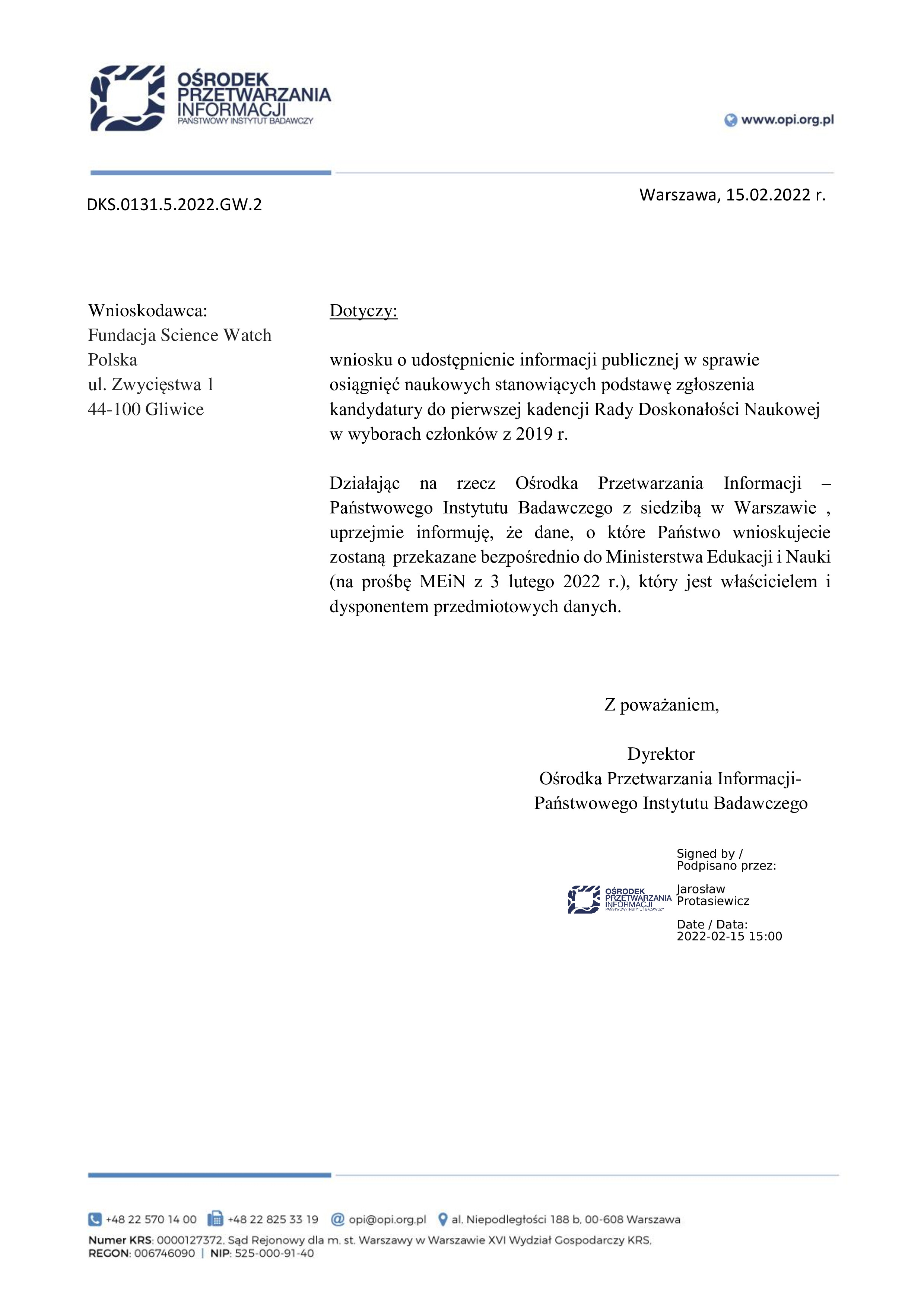 Ponieważ wybory do RDN odbywały się za pośrednictwem Ośrodka Przetwarzania Informacji – Państwowego Instytutu Badawczego (OPI PIB), kolejny wniosek wysłaliśmy 9 lutego 2022 r. do OPI z prośbą o udostępnienie dokumentów, a „w przypadku nieposiadania dokumentów o wskazanie, do jakiej jednostki dokumentacja została przekazana po wyborach do RDN oraz kto obecnie jest w posiadaniu ww. dokumentacji”.