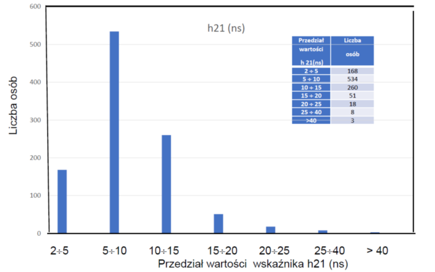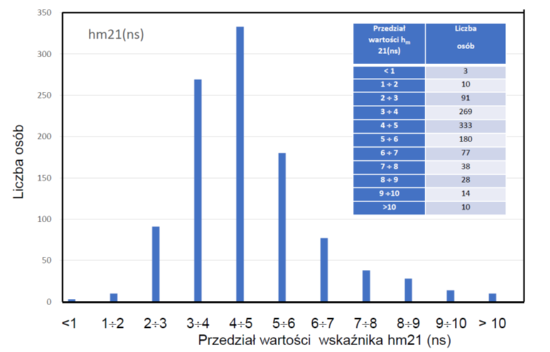 Odpowiadający im rozkład wskaźnika hm21(ns) dowodzi, że najczęstsze przypadki publikacji dotyczą przedziału od 3 do 6, co stanowi (782/1006), czyli 77,73% ogółu wykazanych wartości tego wskaźnika. Najwyższe wykazane wartości indeksu hm to 12,5000 i 13,8556. Czyli indeksy 50 i 51 uzyskano przy współczynniku udziału indywidualnego odpowiednio 0,058 (5,8%) i 0,27(27%). Najniższy zarejestrowany udział to tylko 0,036 (3,6%). Autorzy ci nie mają żadnych cytowań z publikacji indywidualnych. Najwyższy udział cytowań własnych to ok. 80% dla dwóch osób z najwyższymi wartościami indeksu h za 2021 r. Z drugiej strony osoby z udziałem cytowań własnych do 25% stanowią ok. 80 % ogółu (796/1006). Komentarz odnośnie tych danych i sposobu uzyskania nadmiarowego wzrostu indeksu h wydaje się w być w świetle ogólnych przesłanek merytorycznych zbyteczny.