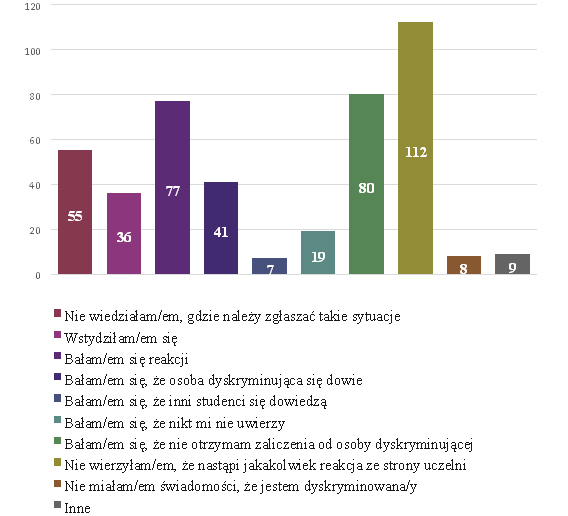Jak wynika z badania, w przytłaczającej większości studentki i studenci nie reagują na dyskryminację. Pomimo że uczelnie zobowiązują się do zapewnienia odpowiednich instrumentów reakcji, powołując nawet specjalne organy, które mają w założeniu pomagać studentom, to grupa, która decyduje się zwrócić o pomoc, jest wciąż znikoma. Niestety ich doświadczenia, które zostaną przedstawione dalej, z pewnością nie motywują innych studentów, by podążyć tym samym śladem. Do respondentów zwrócono się z serią pytań, które mogą pomóc w sprecyzowaniu powodów bierności studentów. Odpowiedzi zostały przedstawione na rysunku 7.