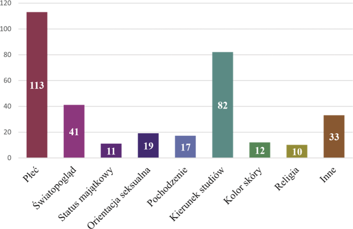 Również w kwestii najbardziej powszechnych powodów dyskryminacji wyniki niniejszego badania są zgodne z danymi zebranymi przez innych badaczy, także w populacji ogólnej. Według informacji zawartej w Biuletynie Informacji Publicznej Rzecznika Praw Obywatelskich jednym z najczęstszych powodów dyskryminacji jest płeć[17] i tak też zdecydowali respondenci w tym przypadku. Drugą w kolejności przyczyną zachowań dyskryminacyjnych wskazywaną przez ankietowanych studentów był kierunek studiów. Nierównomierna reprezentacja poszczególnych kierunków w badanej grupie uniemożliwia jednak sformułowanie rzetelnych wniosków w tej kwestii. W tym celu należałoby przeprowadzić osobne badanie, zorientowane na zebranie porównywalnych reprezentacji ze wszystkich poszczególnych kierunków, pozwalające określić, które z nich są najbardziej narażone na dyskryminację. Mając także na uwadze fakt, iż wielu respondentów jako sprawców dyskryminacji wskazało innych studentów, warto rozważyć zbadanie również tego, czy można wyróżnić konkretne kierunki, których studenci są najbardziej skłonni do dyskryminowania innych.