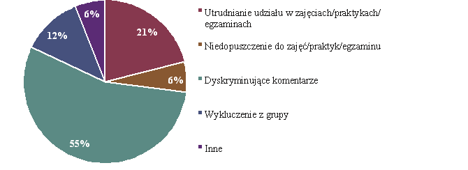 (21% ankietowanych), a nawet na niedopuszczenie do nich (6% ankietowanych). Respondenci sygnalizowali również wykluczenie z grupy (12%). Są to bez wątpienia daleko idące przejawy dyskryminacji, które wymagają realnej i zdecydowanej reakcji uczelni.