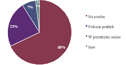 Zdaniem studentów dyskryminacja miała miejsce przede wszystkim na uczelni (68% respondentów). W ankiecie ujęto również przestrzeń online (7% respondentów), mając na względzie nauczanie zdalne oraz portale społecznościowe, za pośrednictwem których studenci kontaktują się ze sobą, wymieniają notatkami czy informacjami. Wskazywano także na dyskryminację występującą podczas praktyk (23% respondentów). Wyniki obrazuje rysunek 6.