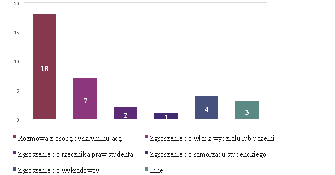 Studenci, którzy reagowali, najczęściej wybierali rozmowę z osobą dyskryminującą (por. rys. 8). Zastanawia fakt, że pomimo dostępności innych sposobów reakcji, przede wszystkim tych oferowanych przez uczelnie, studenci decydują się właśnie na konfrontację. Rodzi się zatem pytanie, czy takie postępowanie wynika ze śmiałości poszczególnych osób, czy z braku wiary w skuteczność działań podejmowanych przez uczelnie. Pomimo że w ankiecie udział wzięło ponad 300 osób, z czego 64% spotkało się z dyskryminacją na uniwersytecie, jedynie w 7 przypadkach zgłoszono dyskryminację do władz uczelni lub wydziału, a w 2 przypadkach zwrócono się do rzecznika praw studenta. W porównaniu z ilością zadeklarowanych przypadków dyskryminacji są to jedynie sporadyczne sytuacje. Określenie powodów braku zgłoszeń pomimo częstotliwości problemu zasługuje na najwyższą uwagę przedstawicieli uniwersytetów. Przedstawione dalej pytania ankietowe i udzielone na nie odpowiedzi zdają się rysować szerszy obraz tej niepokojącej kwestii.