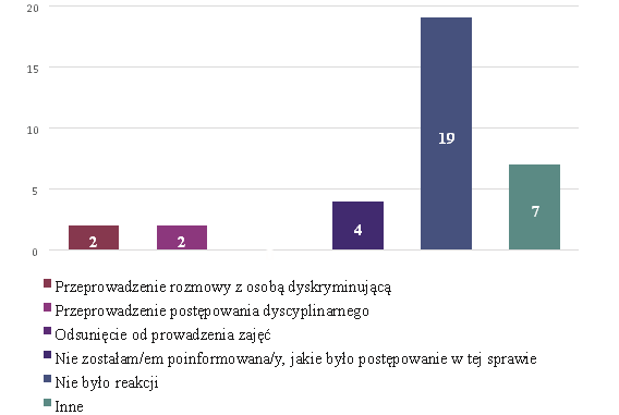 Szukając powodów stojących za niechęcią studentów do podejmowania działań w celu sprzeciwienia się dyskryminacji, warto poświęcić uwagę reakcjom uczelni na zgłaszane przypadki, które zostały odnotowane i zasygnalizowane przez studentów (por. rys. 9). Choć w tym wypadku użycie słowa „reakcja” może okazać się zanadto optymistyczne. Jedynie 2 respondentów wskazało, że uczelnia przeprowadziła postępowanie dyscyplinarne w wyniku zgłoszonej dyskryminacji. W 19 przypadkach studenci zaznaczyli odpowiedź, że zgłoszona sytuacja nie spotkała się z reakcją uniwersytetu, a w 4 przypadkach zgłaszający nie zostali poinformowani o podjętych czynnościach. Takie podejście ze strony władz uniwersytetów z pewnością nie wzbudza zaufania studentów i może wręcz zniechęcić do zgłaszania problemu w przyszłości. Ankietowani nie spotkali się z sytuacją, by osoba dyskryminująca została odsunięta od prowadzenia zajęć, nie można zatem liczyć, że sytuacja zgłaszających uległa poprawie.