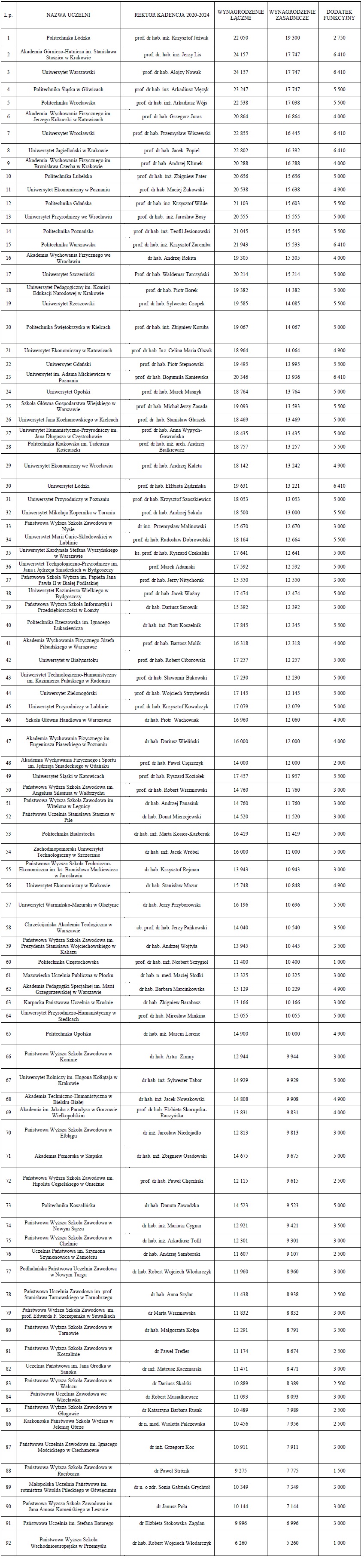 W tabeli 1. przedstawiono zasadnicze wynagrodzenie rektorów wraz z dodatkiem funkcyjnym obowiązujące w latach 2020–2024.