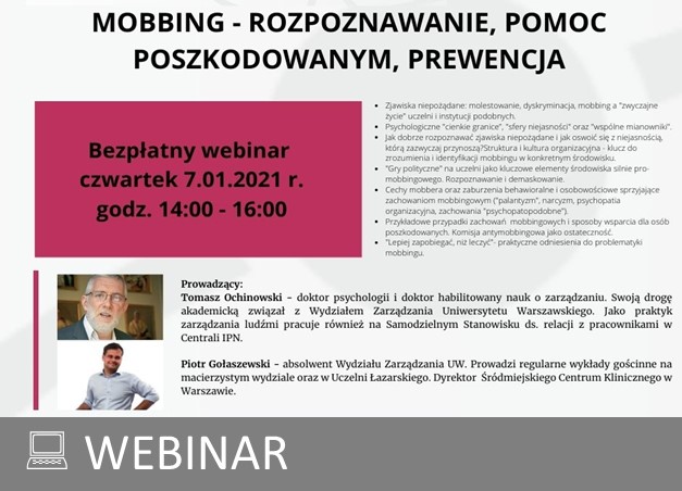 Webinar, pt. Mobbing - rozpoznawanie, pomoc...